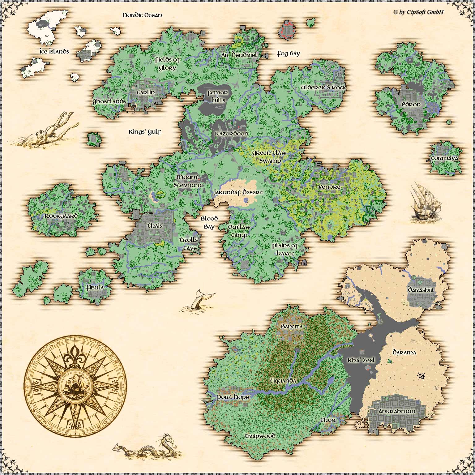 Cities: Ab'Dendriel, Carlin, Kazordoon, Thais and Venore